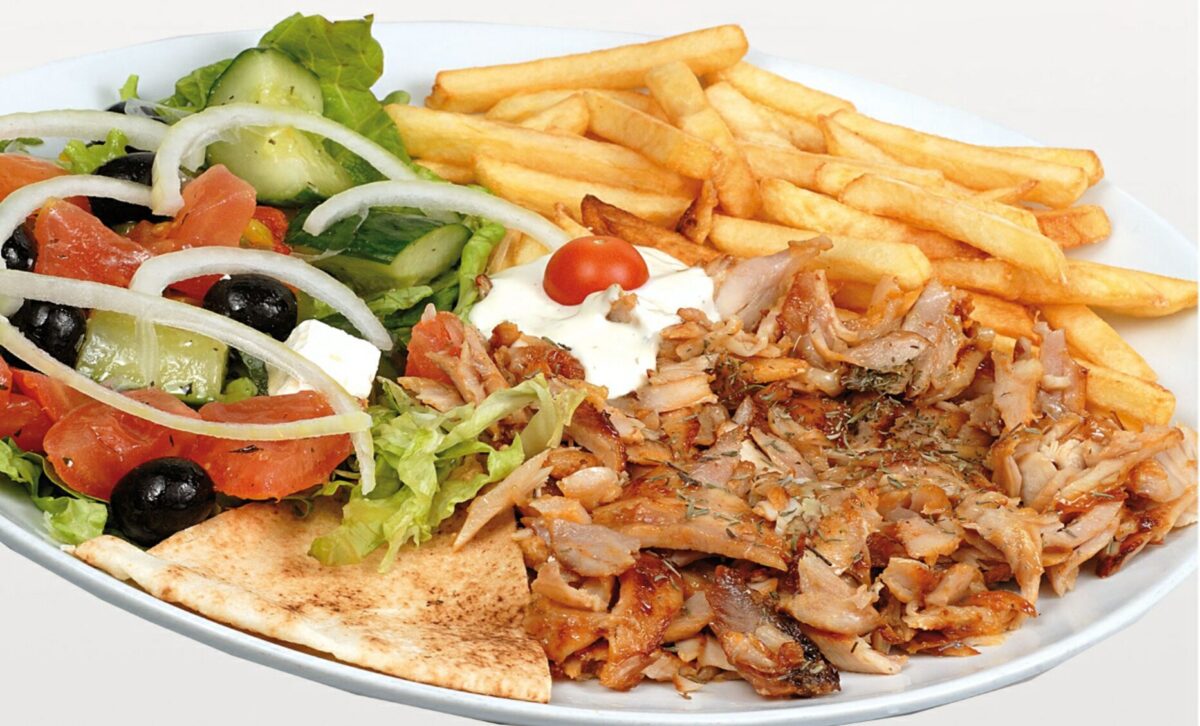 Focaccina, pomodoro, insalata, kebab, patatine, cipolla, salse arabe