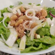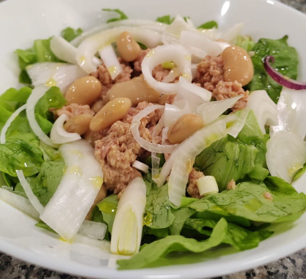 Insalata, mais, tonno, prosciutto cotto, cipolla caramellata, salsa ok